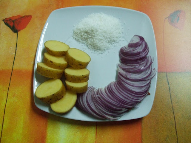 २ लहान बाटाटे साला सकट गोल फोडी करुन.