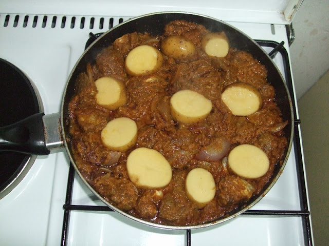 त्यात बटाट्याचे काप घालावे. आणि वर झाकण लावुन (झाकाणावर पाणी ठेवाव) आच मंद ते मध्यम ठेवावी.
