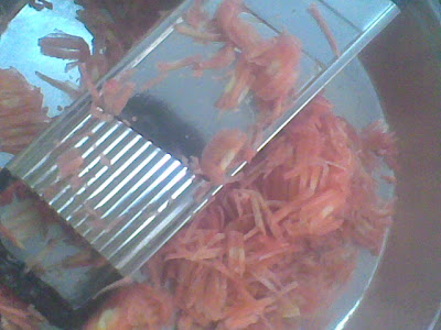 १. सर्वप्रथम गाजरं खिसून घेतली. पण घरात आयत्या वेळी नेहमीची खिसणी मिळाली नाही. कुठे ठेवलीय म्हणून मातोश्रींना फोन करावा म्हटलं तर "उंटावरून शेळ्या" हाकण्याच्या नावानं उद्धार होणार ही शक्यता होती, त्यामुळं ते टाळलं. चिप्स करायची खिसणी हाती लागली आणि तिच्यावरच गाजरांची खिसखिस सुरू केली. त्यातून बटाट्याच्या चिप्ससारखे गाजराचे चिप्स बाहेर पडू लागले.. मग खिसणी नीट धरून खिसायला सुरू केल्यावर एकदाचा बाकायदा गाजरांचा कीस बाहेर पडला!