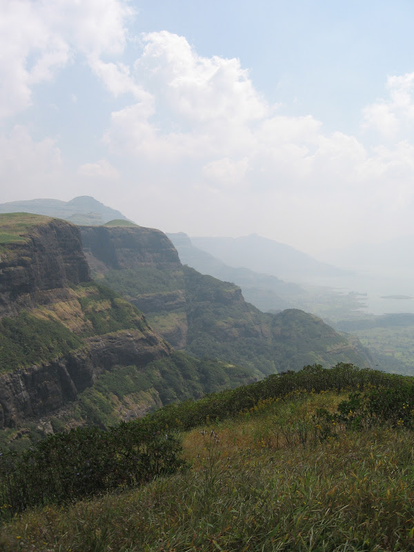 तर आम्ही तोलार खिंडीमधे थोडा वेळ थांबलो. तिथे एक व्याघ्रशिल्प आहे, छान सावली आहे. आजूबाजूचं न्याहाळत बसलो. नंतर मात्र लवकरच निघालो कारण अजून वर चढून दोन तास चाललं की मग हरिश्चन्द्रेश्वराचं मंदिर येणार होतं, रात्री तिथेच थांबायचं होतं. तो कातळ चढणं काही फार अवघड नाही. अवघड आहे ती त्यापुढ्ची वाटचाल. कुठेतरी मी एक नकाशा पाहिला आहे, कातळ चढून वर गेलं, की तिथून मंदिर आहे तीन किलोमीटर्स. आणि ते पण सपाट नाही बरं का..काही छोटे मोठे डोंगर चढत उतरत जायचं आहे..अग आई आई आई ... पण कातळावर गेल्यावर असं काही मस्त द्रुश्य दिसतं ना.