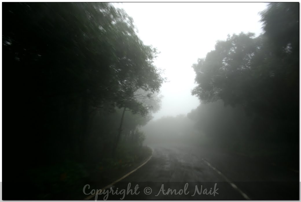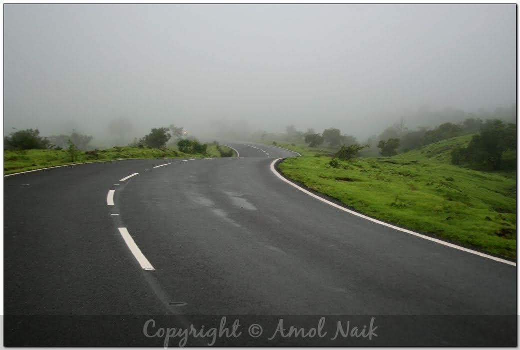 घुसळखांब सोडल्यावर धुकं थोडं कमी झालं. मी फोटोसाठी गाडी थांबवताच बरीचशी मंडळी आपापल्या लघूशंका दूर करण्यासाठी झाडीत पळाली. धुक्याने भरलेल्या त्या पोकळीस दुभंगत जाणारी ती डांबरी सडक फारच मोहक दिसत होती. कोरिगड आणि अॅम्बी व्हॅली डाव्या हाताला ठेऊन आम्ही साळतर कडे निघालो. ज्या रस्त्याला मघाशी नावाजत होतो त्यालाच शिव्या घालण्या इतका तो खराब होता, पण आजूबाजूचा निसर्ग अजूनच खुलत चालला होता. पण माझं लक्ष तिकडे नव्हतंच. ७.३० झाले होते आणि अंधार पडायच्या आत साळतर खिंड पार करुन तैलबैल ला पोहचायचे होते.