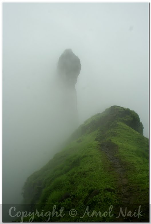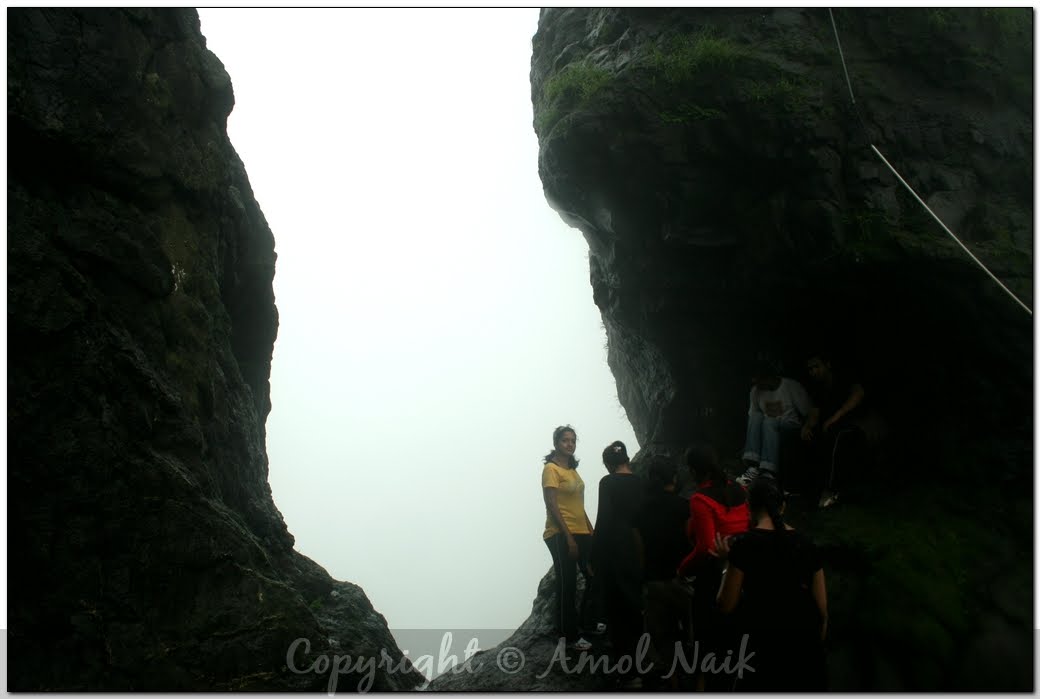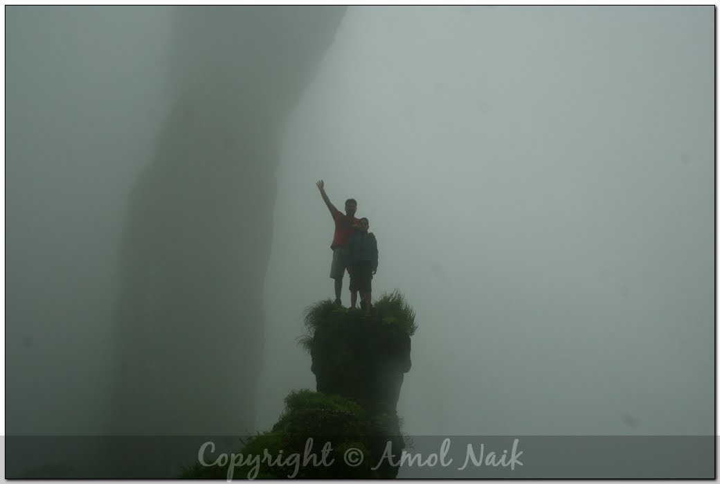 कातळभिंतीचा आणि धुक्याचा लपाछपीचा खेळ सुरूच होता, मधे एकदा दोनदा थोडं धुकं हटलं आणि मला सुरेख फोटो(?) मिळाले. भिंतीच्या थोडंअलिकडे एक अगदी छोटा असा उंचवटा आहे. अविनाशच्या मते त्याचं नाव "ब्राम्हण" आहे. (त्याने सांगितलेलं कारण न सांगणे मला जास्त योग्य वाटते !! ) मग त्या ब्राम्हणावर चढून मी आणि अविनाशने एक झक्कास फ़ोटो काढून घेतला आणि भिंत उजव्या हाताला ठेऊन खिंडीकडे मोर्चा वळविला.